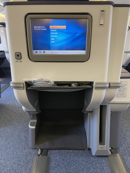 久しぶりのプレミアムクラスということもありましたし、機材は76Eということもありました。この76E、プレミアムクラス(国際線はビジネスクラス)のシート配列は、2-1-2という独特なものです。中央の1となっているシートは、座って右手に大型収納があるという特徴があります。