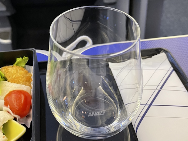 グラスはガラス製で、エコノミークラスの紙コップとは雲泥の差がありますね。グラスの底には、ANAの刻印入りです。